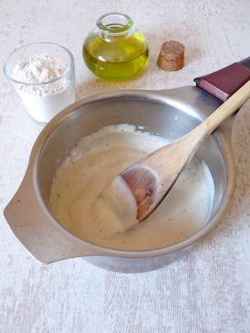 1) mélangez 3 cuillères à soupe bombée de farine de riz, avec 1 cuillère à soupe de farine de quinoa, 150 à 200 ml de lait de riz, et 2 cuillères à soupe d’huile d’olive.